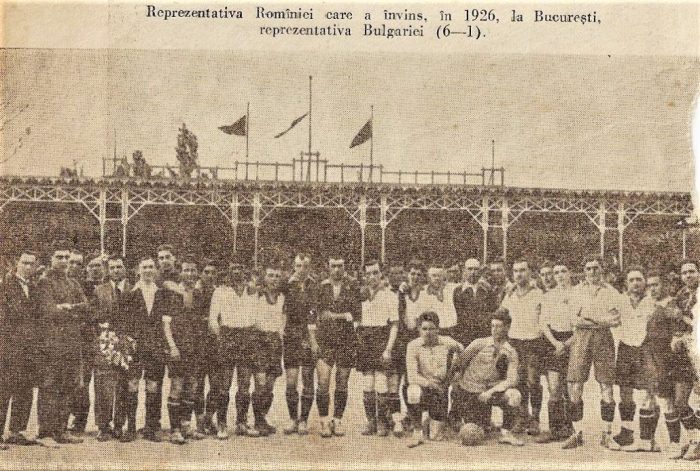 25 aprilie 1926, stadionul Romcomit, Bucureşti: echipele României şi Bulgariei într-o fotografie de grup înaintea meciului. Românii sunt cei cu tricouri închise. Între ei, braşovenii Geller şi Kiss.