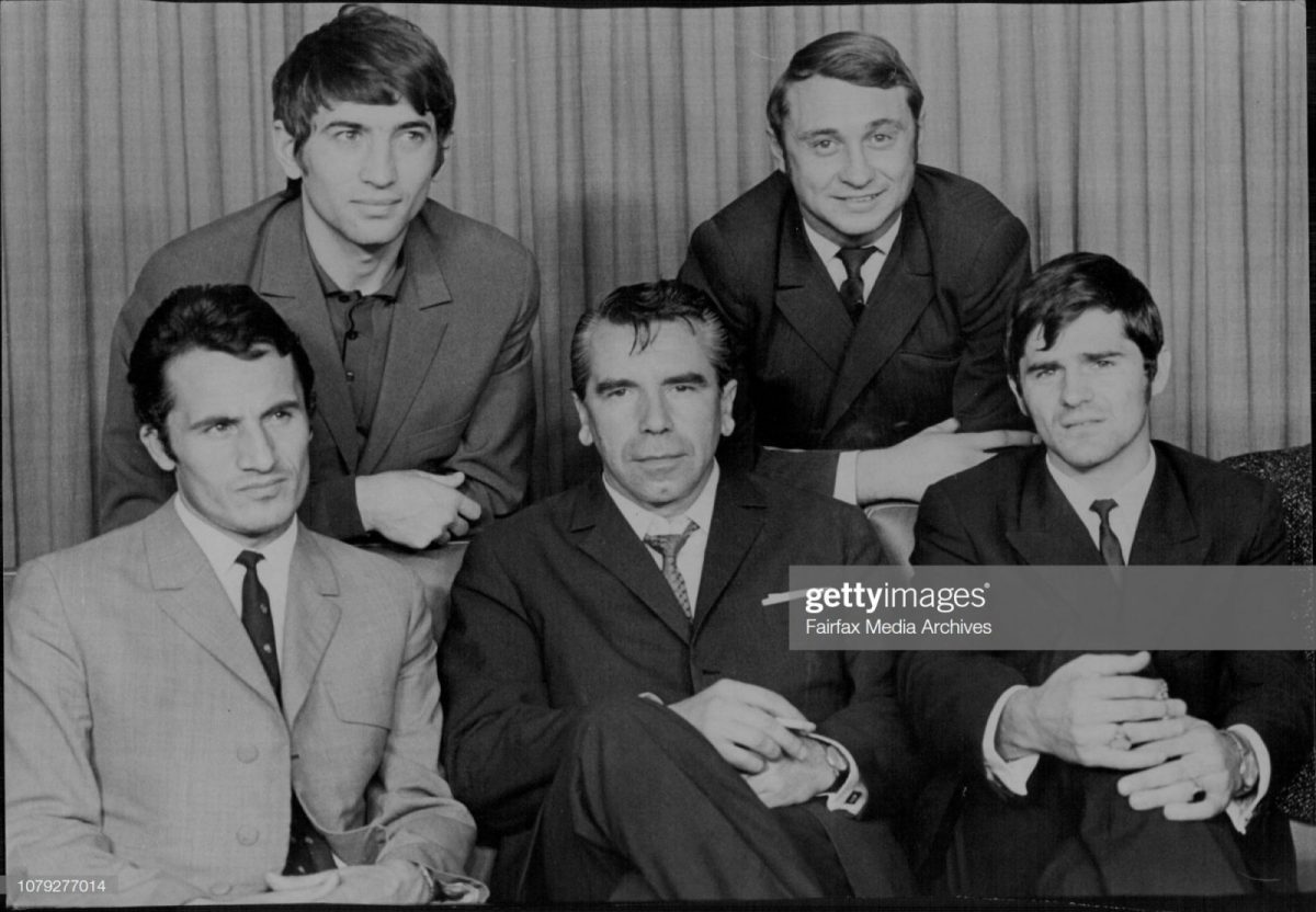 Romanian National Soccer team pictured after their arrival in Sydney today. (Left to right from row) Ivancescu Mihai (Capt), Mardarascu Vintila (coach), Pescaru Nicolae. Back row Anca Dan, Antonescu Dumitru. January 01, 1970. (Photo by Barry James Gilmour/Fairfax Media via Getty Images).