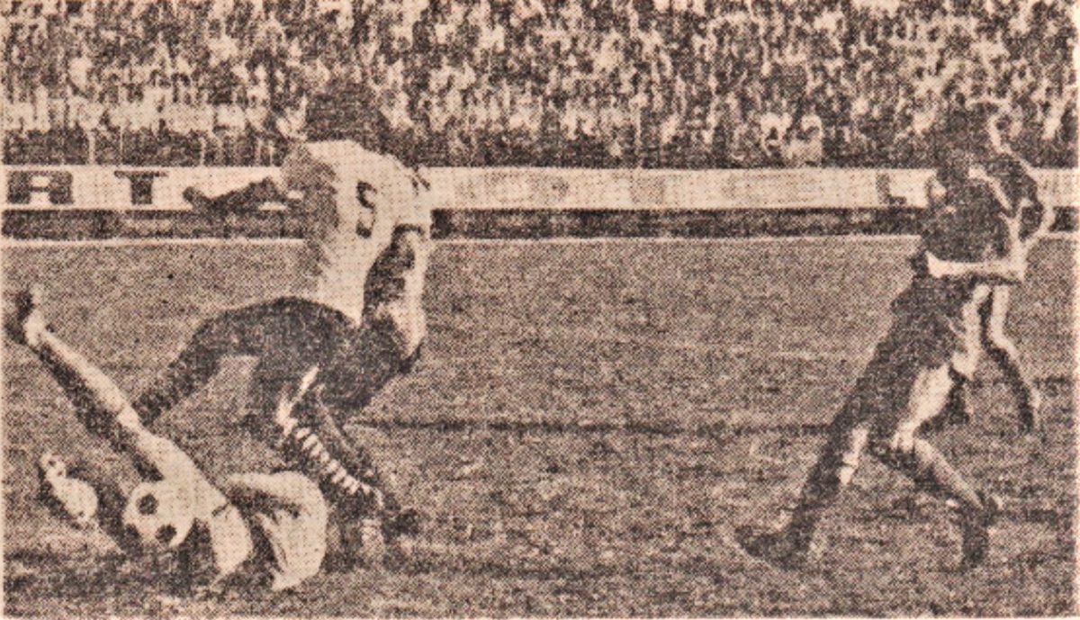 „BRAŞOV. Steagul roşu deschide scorul (min. 4): Mateescu l-a lansat pe Anghel, acesta a centrat şi Pescaru (nr. 5) a reluat pe lângă Nagel, ieşit la blocaj.” foto de S. BAKCSY