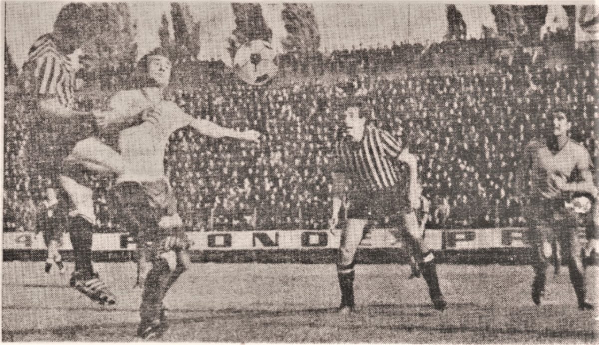 „BRAŞOV. Pescaru se avîntă în careul constănţenilor, şutînd cu capul mingea centrată de undeva din dreapta lui Iambor.” foto de W. FEHER