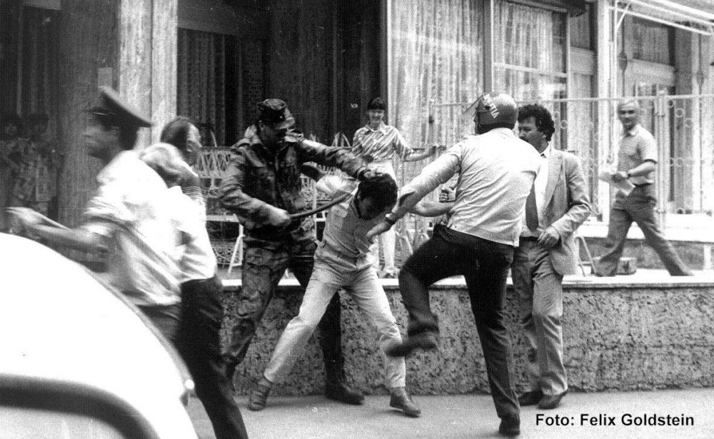 14 iunie 1990. Doi poliţişti asaltează un protestatar. / foto de Felix Goldstein