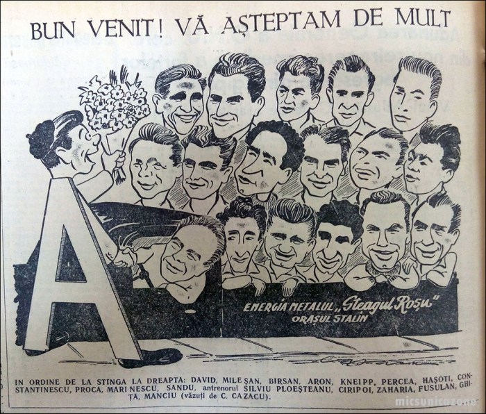 - dreapta: desen apărut în ziarul local „Drum Nou” care celebrează promovarea „stegarilor” în Categoria A.