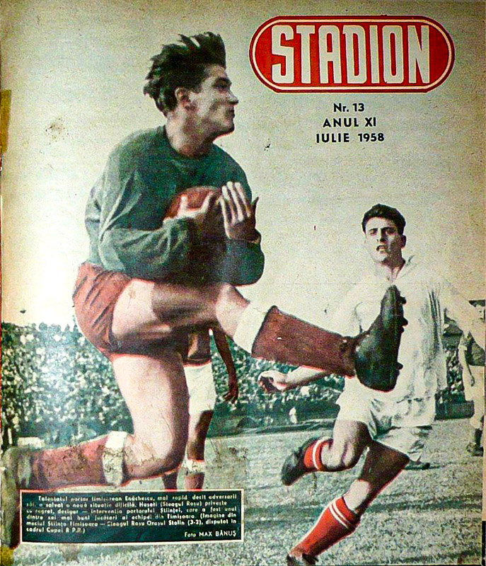 - dreapta: portarul timișorean Mircea Enăchescu reține în fața „stegarului” Emanoil Hașoti în semifinalele Cupei RPR, pe 29 iunie 1958, în fața unui arhiplin stadion „Republicii”. Meciul s-a jucat pe teren neutru, la București. (colorizarea copertei s-a făcut manual și conține o eroare – jambierele lui Hașoti trebuiau să fie albastre).