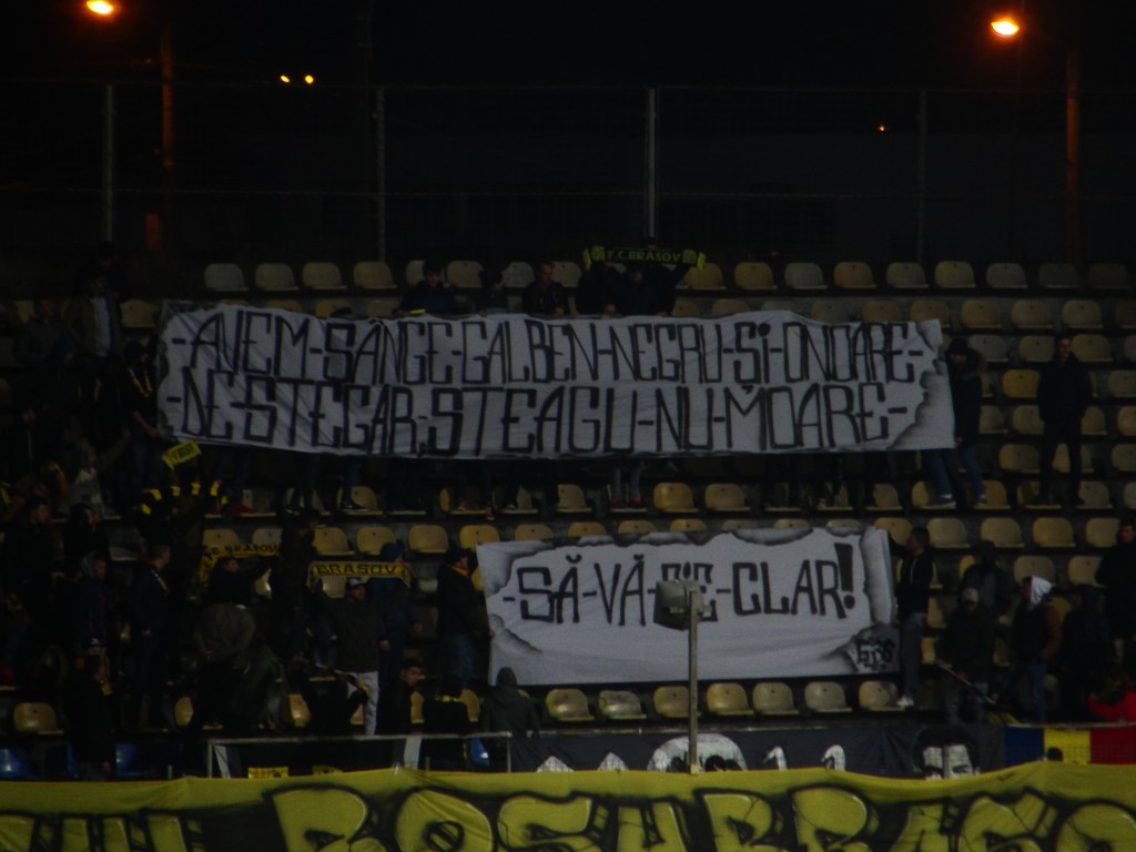 - dreapta: în timpul meciului cu Olimpia Satu Mare (3-0): „Avem sânge galben-negru și onoare de stegar – Steagu’ nu moare – să vă fie clar!”
