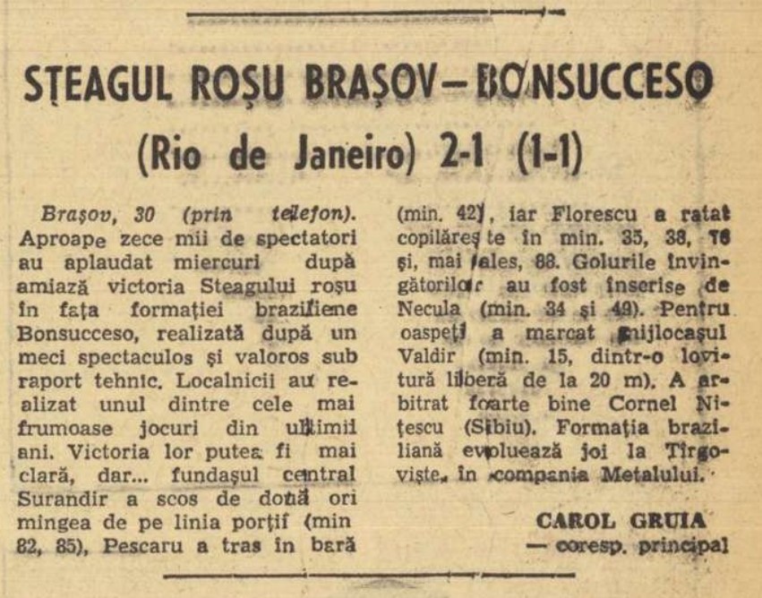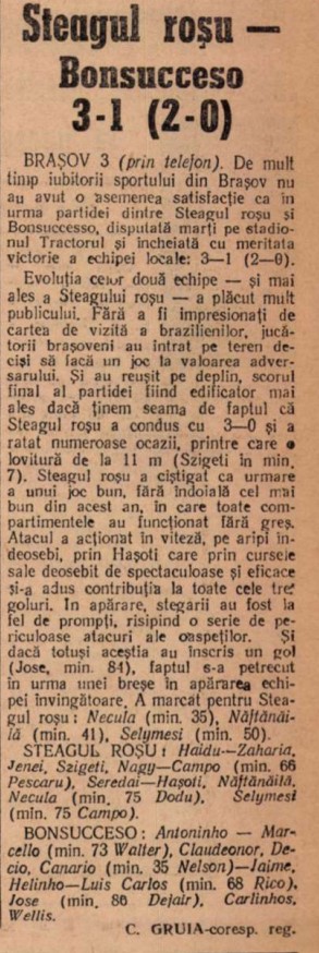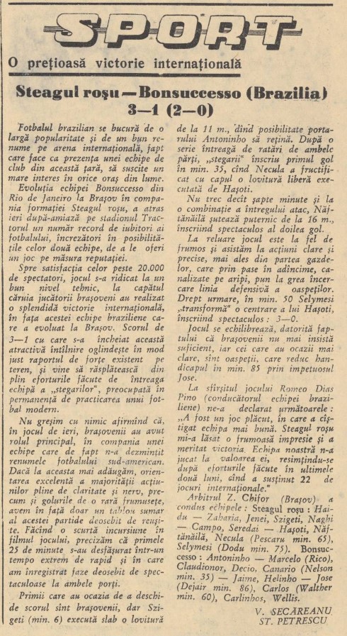 Recomandată pentru spectaculozitatea jocului său, precum și prin rezultatele obținute pînă acum, echipa F.C. Bonsucceso este așteptată cu legitim interes de iubitorii fotbalului din Brașov. De fapt, întîlnirea de azi cu Steagul roșu constituie pentru fotbaliștii brazilieni un prilej de revanșă pentru înfrîngerea suferită în urmă cu patru ani, cînd stegarii au terminat învingători cu scorul de 3-1.”