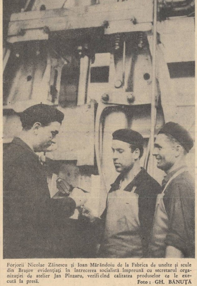 „Forjorii Nicolae Zăinescu și Ioan Mărăndoiu de la Fabrica de unelte și scule din Brașov evidențiați în întrecerea socialistă împreună cu secretarul organizației de atelier Jan Pînzaru, verificînd calitatea produselor ce le execută la presă.” / Foto: Gh. Bănuță, Drum Nou, 27 mai 1965