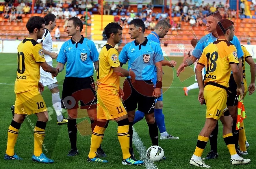 - David Distéfano (nr. 11) salută brigada de arbitri înaintea meciului cu Gaz Metan Mediaș din prima etapă a sezonului 2011-2012. / FOTO: prosport.ro