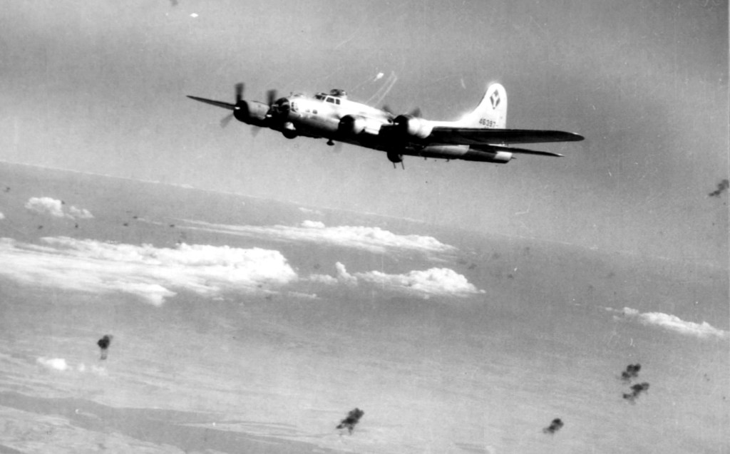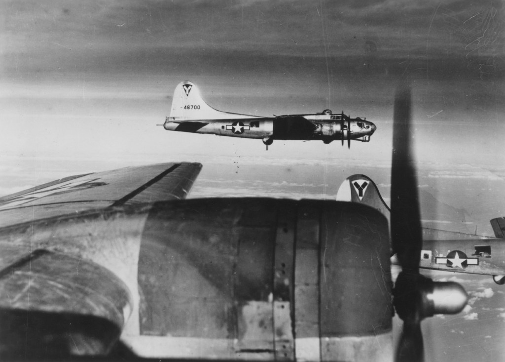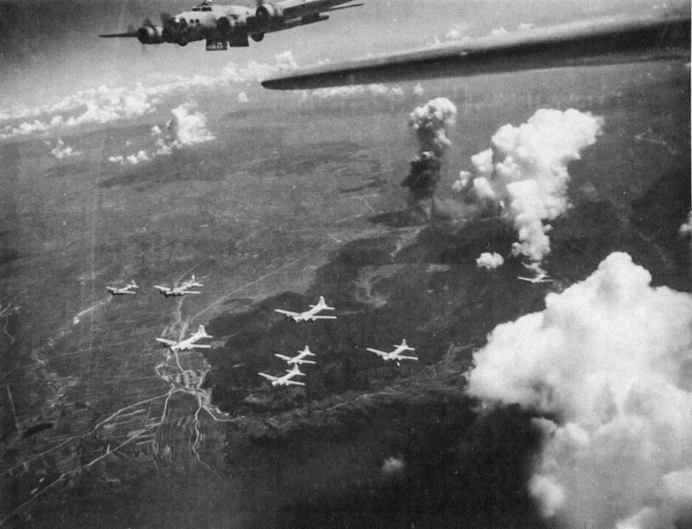 - dreapta: avioanele B-17 Flying Fortress s-au regrupat pentru revenirea la bazele din Italia. În urma lor, unul din nori este mai întunecat decât restul, unind cerul cu pământul. / FOTO: Digital Public Library of America