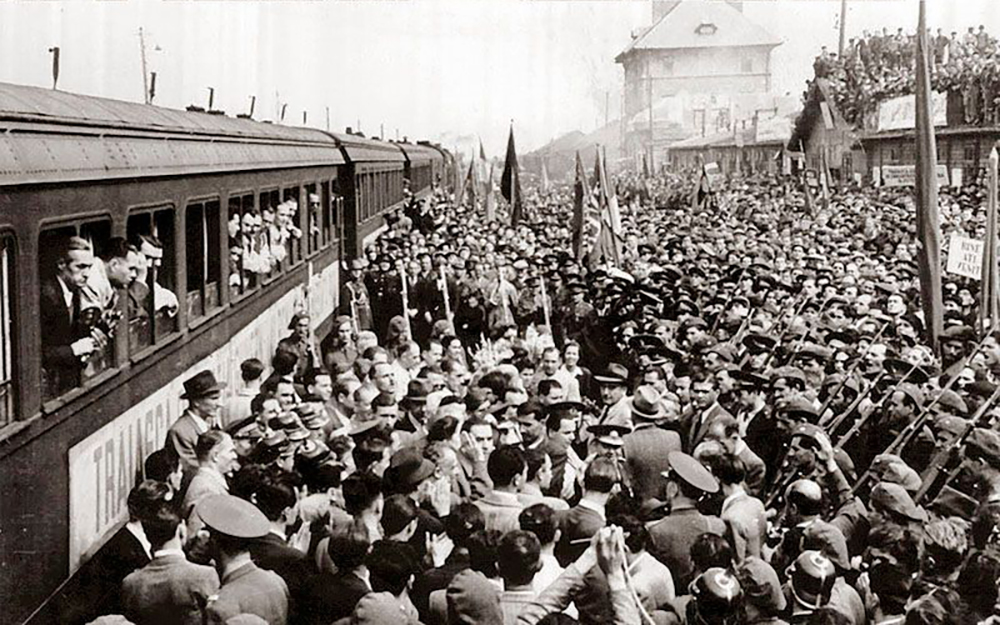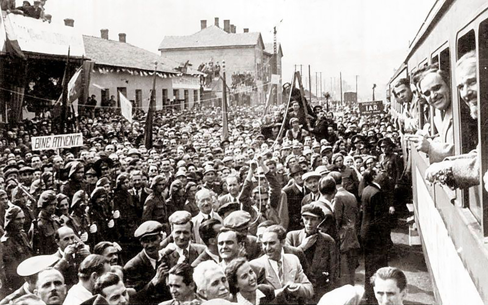 - sus: trenul care aduce delegația României de la Conferința de Pace de la Paris (1947) face o oprire în ce mai rămăsese din Gara Brașov, în uralele a mii de oameni. Cele două clădiri etajate, vizibile în extremități, există și astăzi – singurele reminiscențe ale altui peisaj. / FOTO: arh. Gruia Hilohi