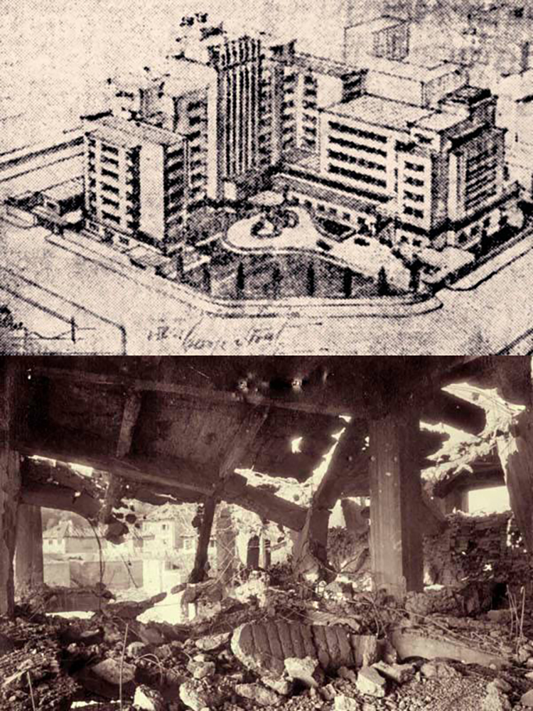 - dreapta: schița spitalului, proiectat în manieră cubistă, și imagine cu daunele provocate pe 6 iunie 1944 primului corp de clădire aflat în construcție. / FOTO: arh. Gruia Hilohi.