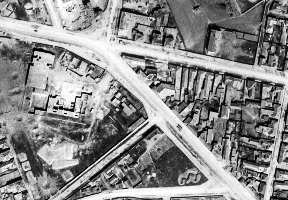 - stânga: vedere aeriană cu intersecția Toamnei după bombardamentul de pe 16 aprilie 1944, șantierul spitalului fiind în stânga sus, se văd și urmele câtorva cratere de bombe.