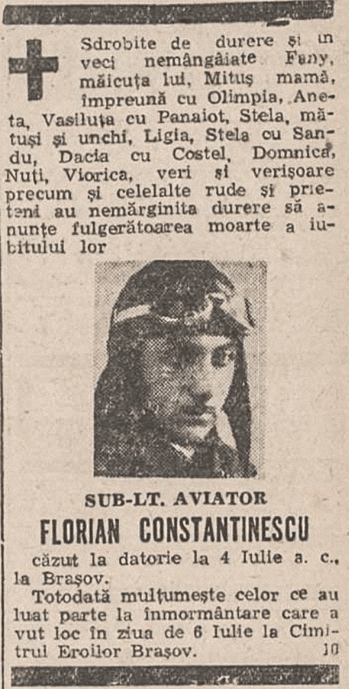 Sdrobite de durere și în veci nemângâiate Fany, măicuța lui, Mituș mamă, împreună cu Olimpia, Aneta, Vasiluța cu Panaiot, Stela, mătuși și unchi, Ligia, Stela cu Sandu, Dacia cu Costel, Domnica, Nuți, Viorica, veri și verișoare precum și celelalte rude și prieteni au nemărginita durere să anunțe fulgerătoarea moarte a iubitului lor SUB-LT. AVIATOR FLORIAN CONSTANTINESCU căzut la datorie la 4 Iulie a. c., la Brașov.”