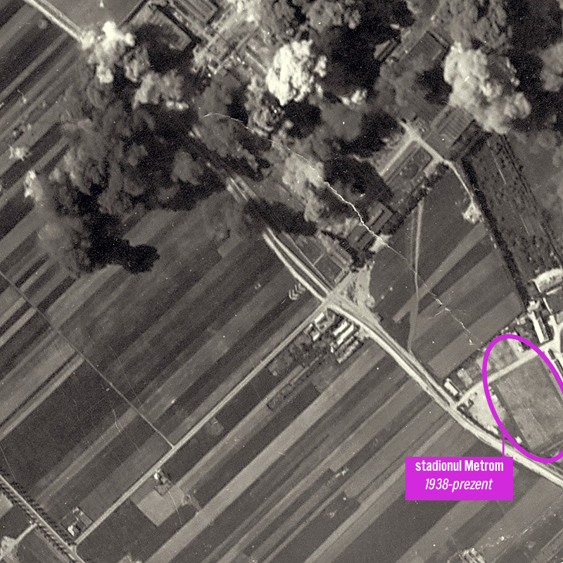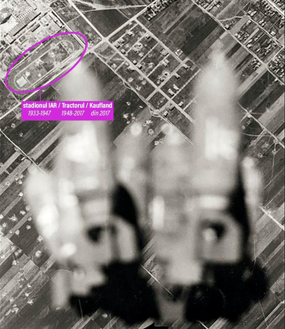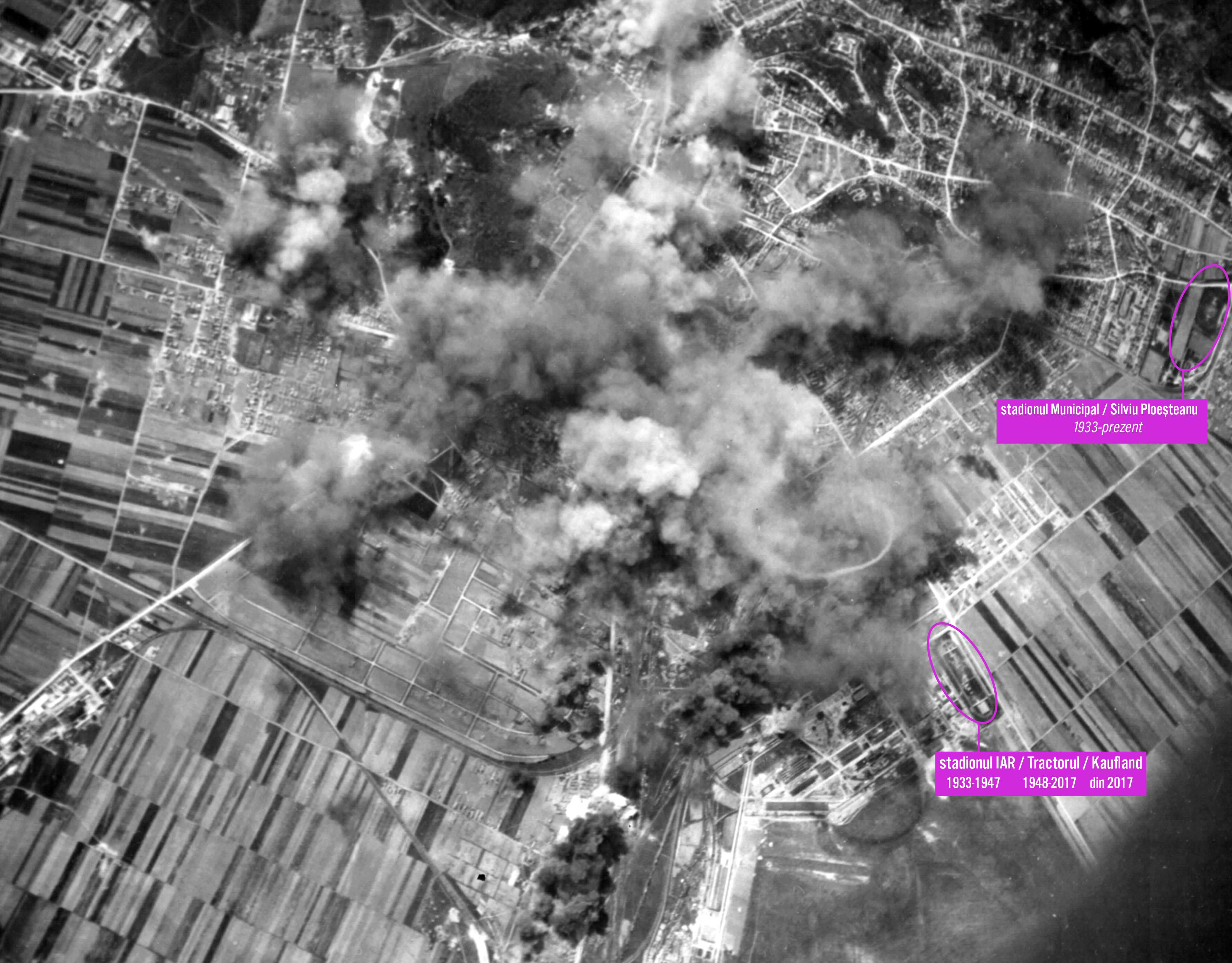 - de la stânga la dreapta: zona cartierului Scriitorilor în toamna anului 1944 (str. Zizinului este în partea de jos), craterele exploziilor vor fi vizibile în oraș mult timp; stadionul Tractorul, avariat de bombe, fotografiat în timpul misiunii de pe 4 iulie 1944; stadioanele IAR/Tractorul și Silviu Ploeșteanu fotografiate în bombardamentul de pe 16 aprilie; stadionul Metrom lângă Uzinele Astra Brașov, lovite în bombardamentul de pe 6 iunie. / FOTO: arh. Gruia Hilohi