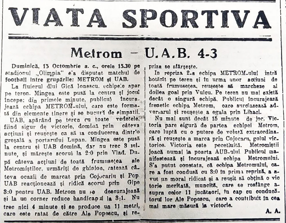 În avancronica aceluiași ziar local se mai menționa că „favoritul jocului este gruparea „U.A.B.” dar pe teren lucrurile se pot schimba. Echipa „Metromului”, fiind o echipă tânără, fără experiențe în jocuri grele, sperăm că va face figură onorabilă.”