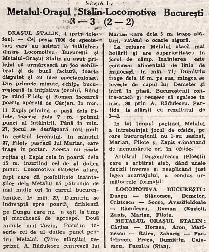 Răspunsul stegarilor a venit în următoarele șase minute. După ce Dumitriu l-a driblat pe portarul Dungu și a marcat în poarta goală (min. 29), Fusulan a stabilit scorul pauzei la 2-2 în minutul 31. Metalurgiștii din Orașul Stalin întorc rezultatul în partea secundă, Dumitriu reușind propria sa dublă în minutul 71, cu un șut deviat de la 16 metri. Cu zece minute rămase de jucat, singura nesincronizare la offside a fundașilor stegari a fost pedepsită de Andrei Rădulescu, și scorul este egal, 3-3!