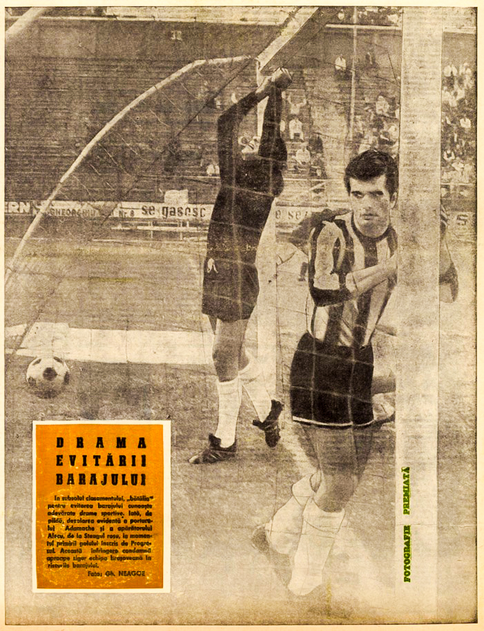 - coperta revistei Fotbal arată dezamăgirea portarului Adamache și a fundașului central Alecu după primirea golului; stegarii se luptă să respingă un atac; duel pentru minge între Matei și Alecu. / FOTO: Fotbal (16 mai 1968) Informația Bucureștiului (1 mai 1968) și Sportul (29 iunie 1968)