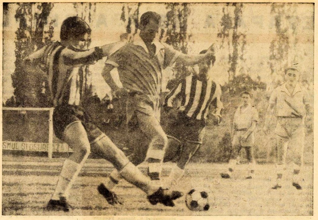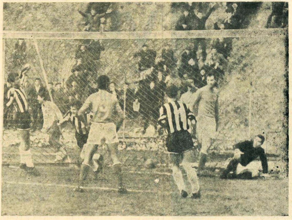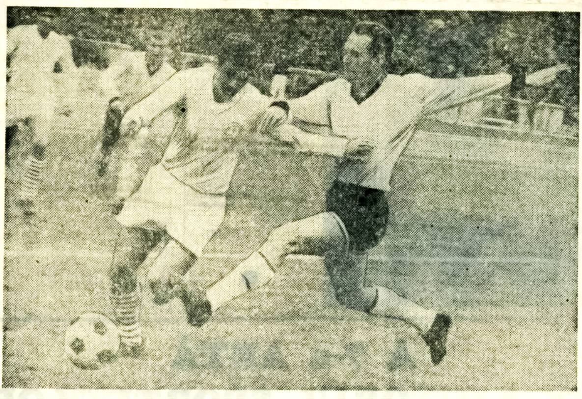 - Cezar Ardeleanu șutează și deschide scorul în minutul 9, Györffy este întins pegazon. / FOTO: Drum Nou (28 mai 1968)