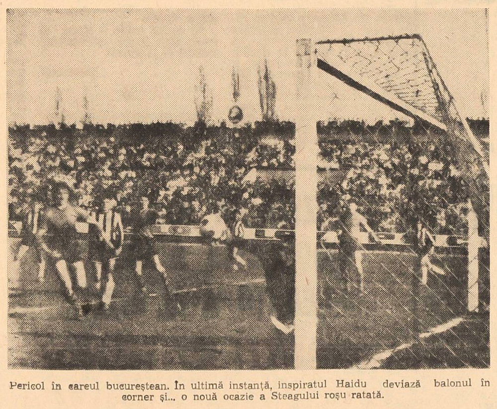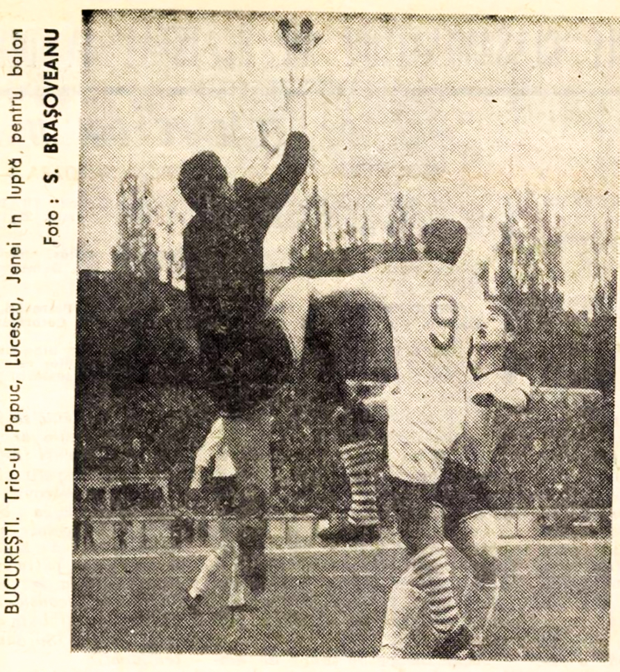 - portarul Papuc și fundașul Alecu opresc un atact dinamovist; Papuc și Jenei (cu fața) în duel cu Mircea Lucescu; același Lucescu întâmpinat de căpitanul stegarilor Nicolae Campo. / FOTO: Sportul (24 iunie 1968), Fotbal (18 aprilie 1968), Sportul (14 aprilie 1968)