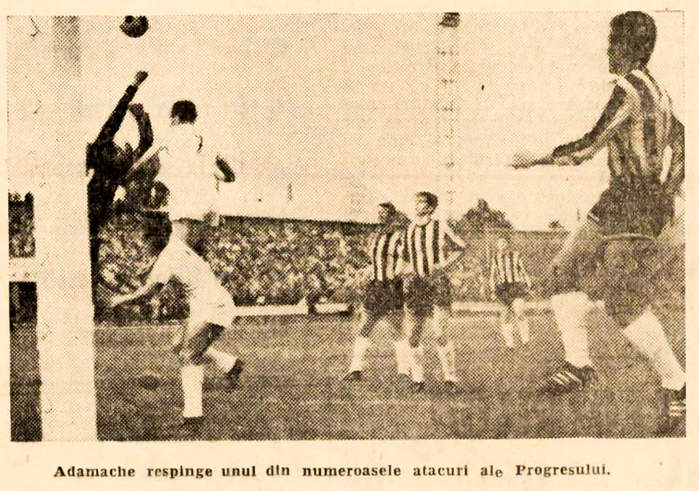 - un jucător stegar își driblează adversarul în meciul cu Politehnica Galați; Papuc boxează un atac al Crișului sub privirile coechipierului cu nr.-ul 6; Adamache, Jenei și Ivăncescu pierd duelul aerian cu atacantul progresist Țarălungă; Adamache din nou trebuind să facă față presiunii bucureștenilor, urmărit pe fundal de doi coechipieri. / FOTO: Fotbal, (27 iunie 1968), Crișul (28 iunie 1968), România Liberă și Szabad Szó Timișoara (2 iulie 1968)