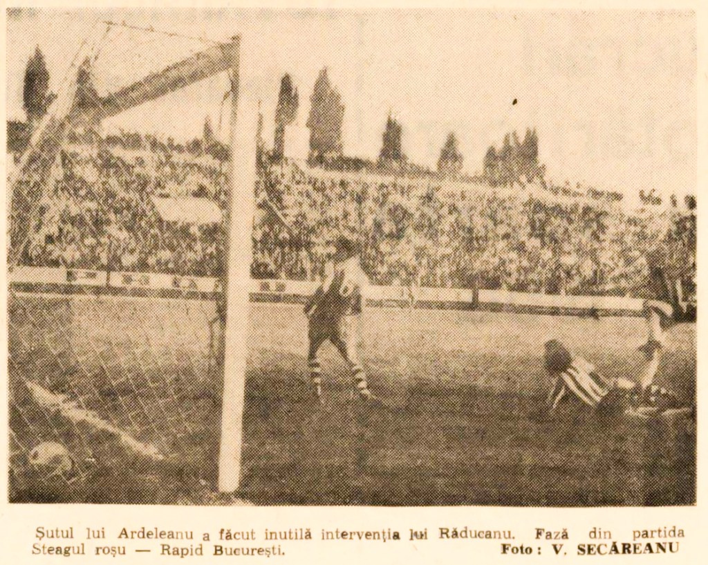 - Ivăncescu nu poate bloca șutul lui Mureșan, care face 2-0. Adamache și fundașul Jenei, plan-secund, sunt scoși din fază de pasele gazdelor; gazdele se bucură, stegarii, cu mâinile în șold, se gândesc acum la baraj. / FOTO: Vörös Zászló și Steaua Roșie Tg. Mureș, (11 iunie 1968)