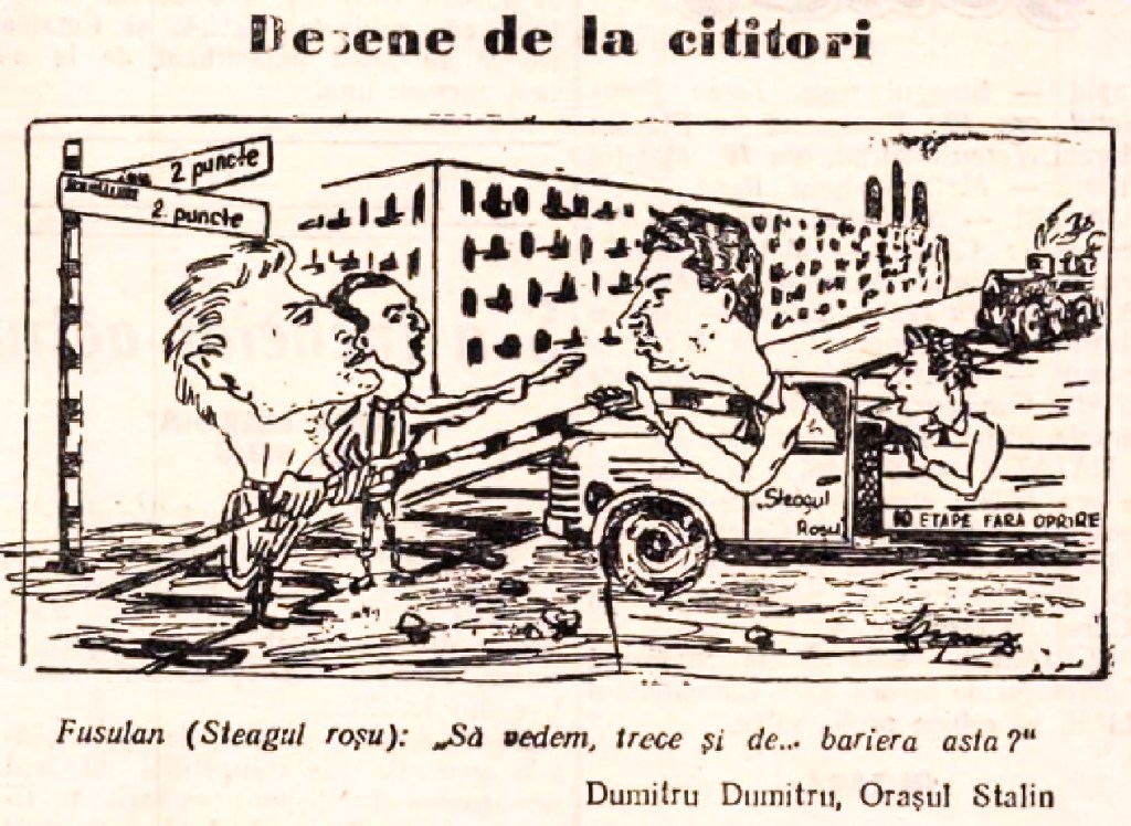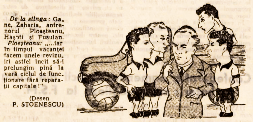 - „De la stînga: Gane, Zaharia, antrenorul Ploeșteanu, Hașoti și Fusulan. Ploeșteanu: … iar în timpul vacanței facem unele revizuiri astfel încât să-i prelungim pînă la vară ciclul de funcționare fără reparații capitale!” / Desen P. Stoenescu pentru Munca (24 noiembrie 1959)