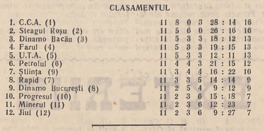 Stegarii au ratat titlul onorific de campioni de toamnă, terminând la egalitate de puncte cu CCA București (viitoarea Steaua), dar cu golaveraj +10, față de +14 al militarilor. Rapidiștii, însă, le oferă neînvinșilor stegari o gardă de onoare la ieșirea de pe teren.