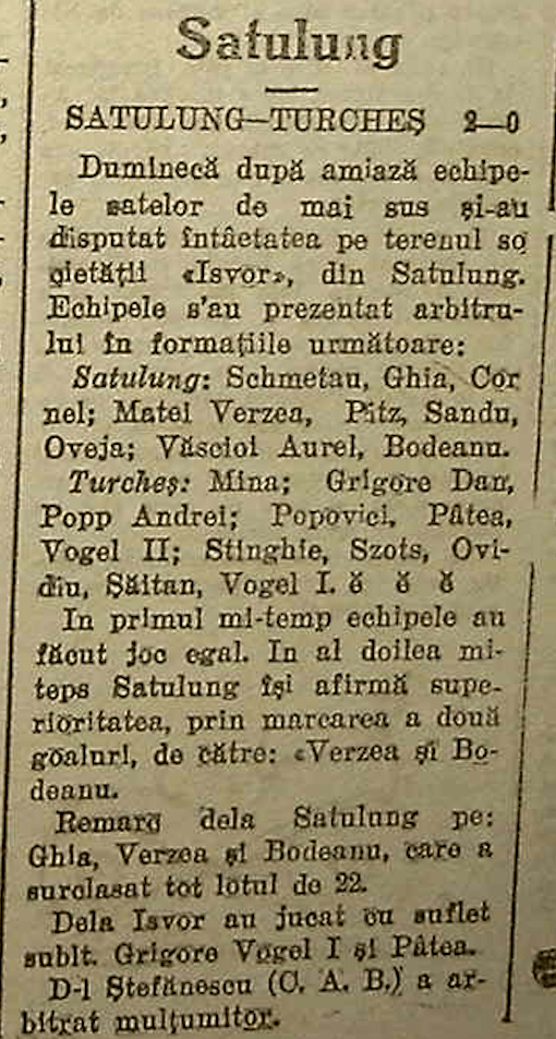 Iată-ne acum în postura de a putea celebra un secol mai târziu după-amiaza unei duminici de august a anului 1925, în care Schmetau, Ghia, Cornel, Matei, Verzea, Pitz, Sandu, Oveja, Aurel, Văscioi și Bodeanu din Satulung s-au aflat față-n față vreme de 90 de minute cu Mina, Dan Grigore, Andrei Popp, Popovici, Pâtea, Vogel II, Stinghie, Szots, Ovidiu, Șăitan și Grigore Vogel I din Turcheș (unul din celelalte Șapte Sate, devenit între timp cartier al municipiului Săcele).