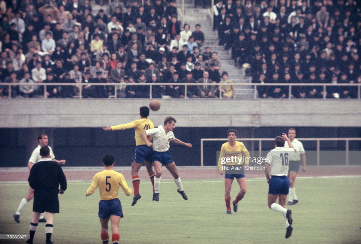 Constantin Koszka câştigă un duel aerian în meciul România – RDG de pe 13 octombrie 1964 (Photo by The Asahi Shimbun via Getty Images)